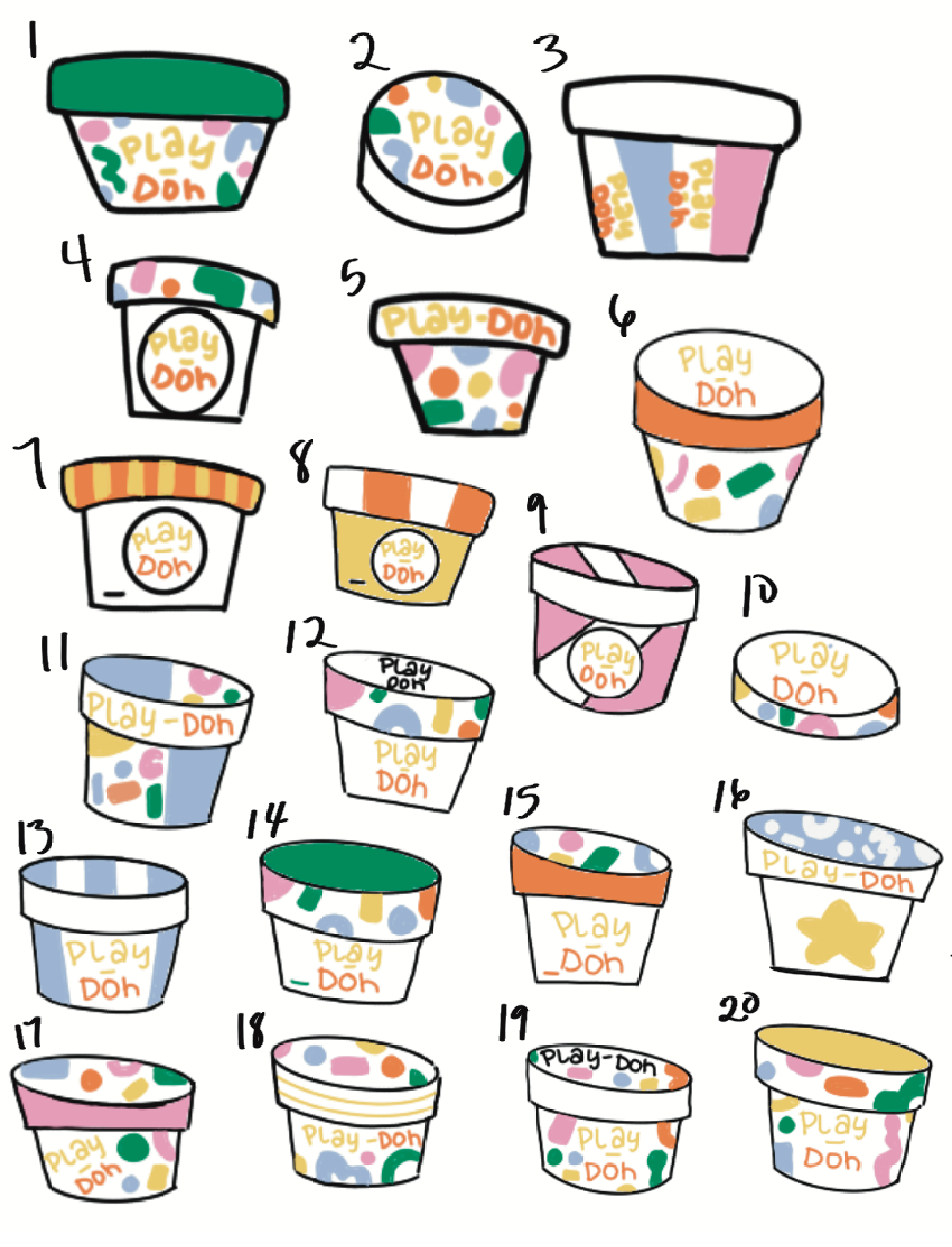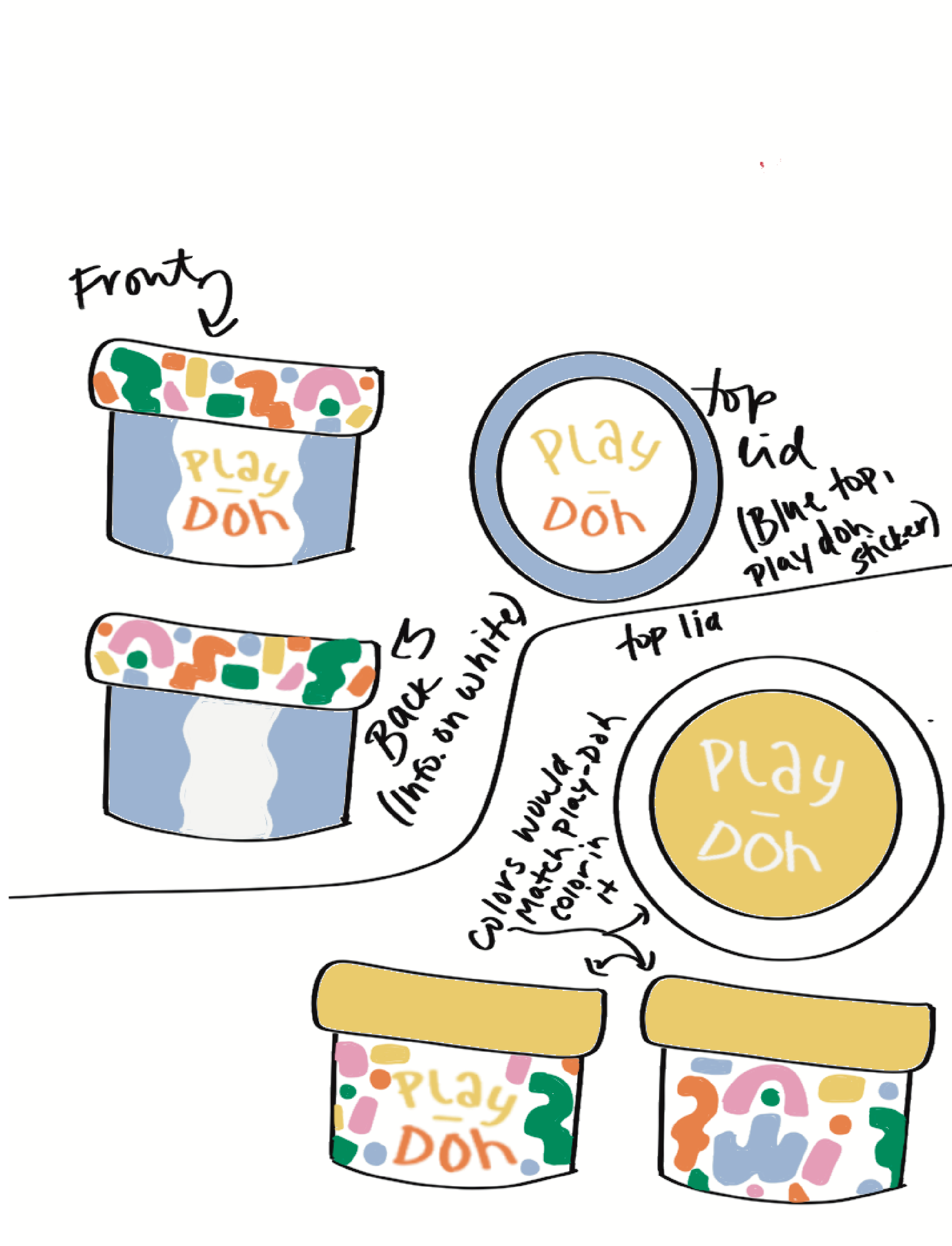 The design approach was inspired by organic patterns of shapes that kids’ make when playing with play-doh. The logo was meant to keep the same feel of the original but made to be more fun, and simpler. The color palette consists of their iconic yellow shade, and then has pastel shades of pink, blue, green, and orange. The pattern was put around the container with the logo at the front and on the top of the container, using the color that the play-doh resembles inside. My AR feature is on the box that the two eco-friendly containers of play-doh come in. There are two “Mood Buddies” that are happy and silly and if you scan them they come to life and do dances to songs that resemble their moods.