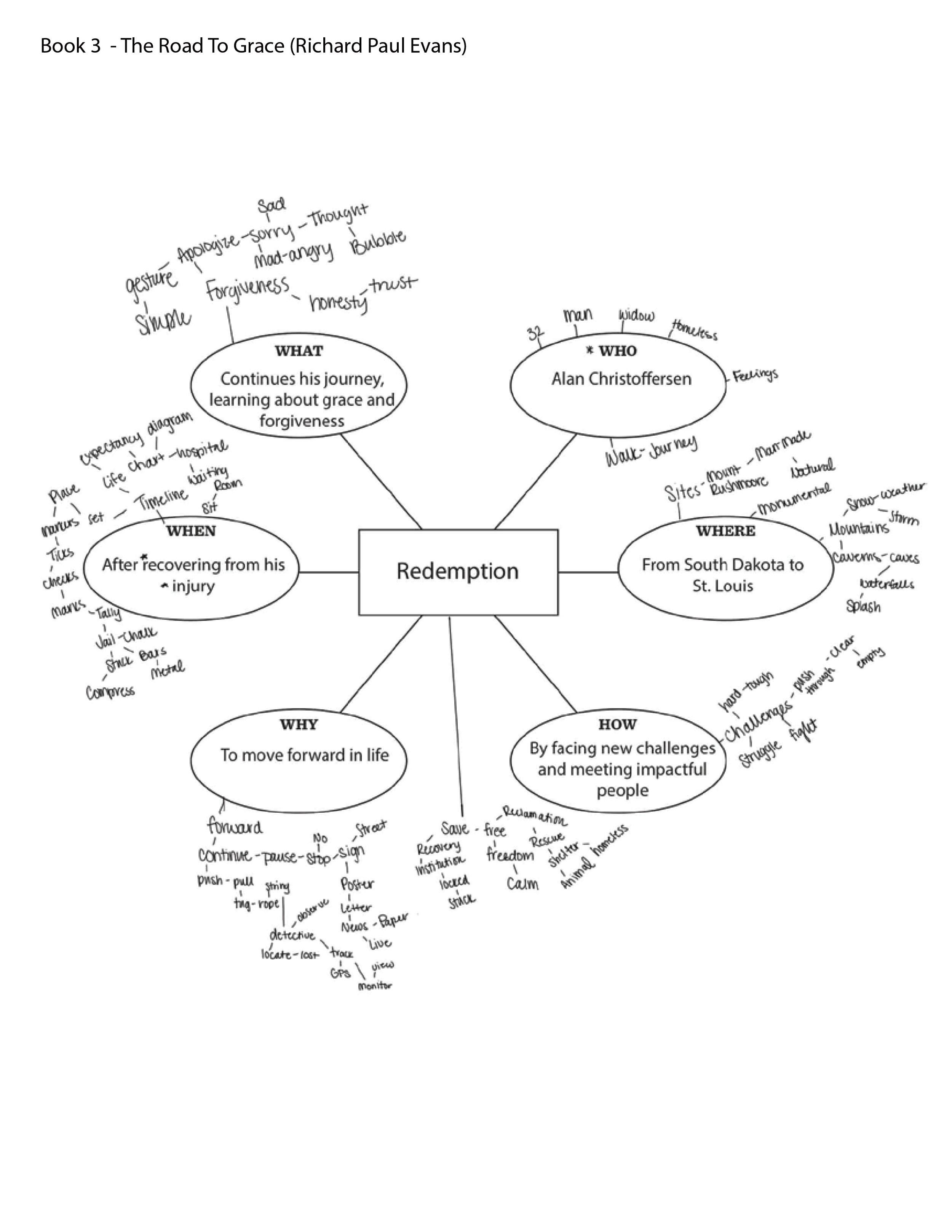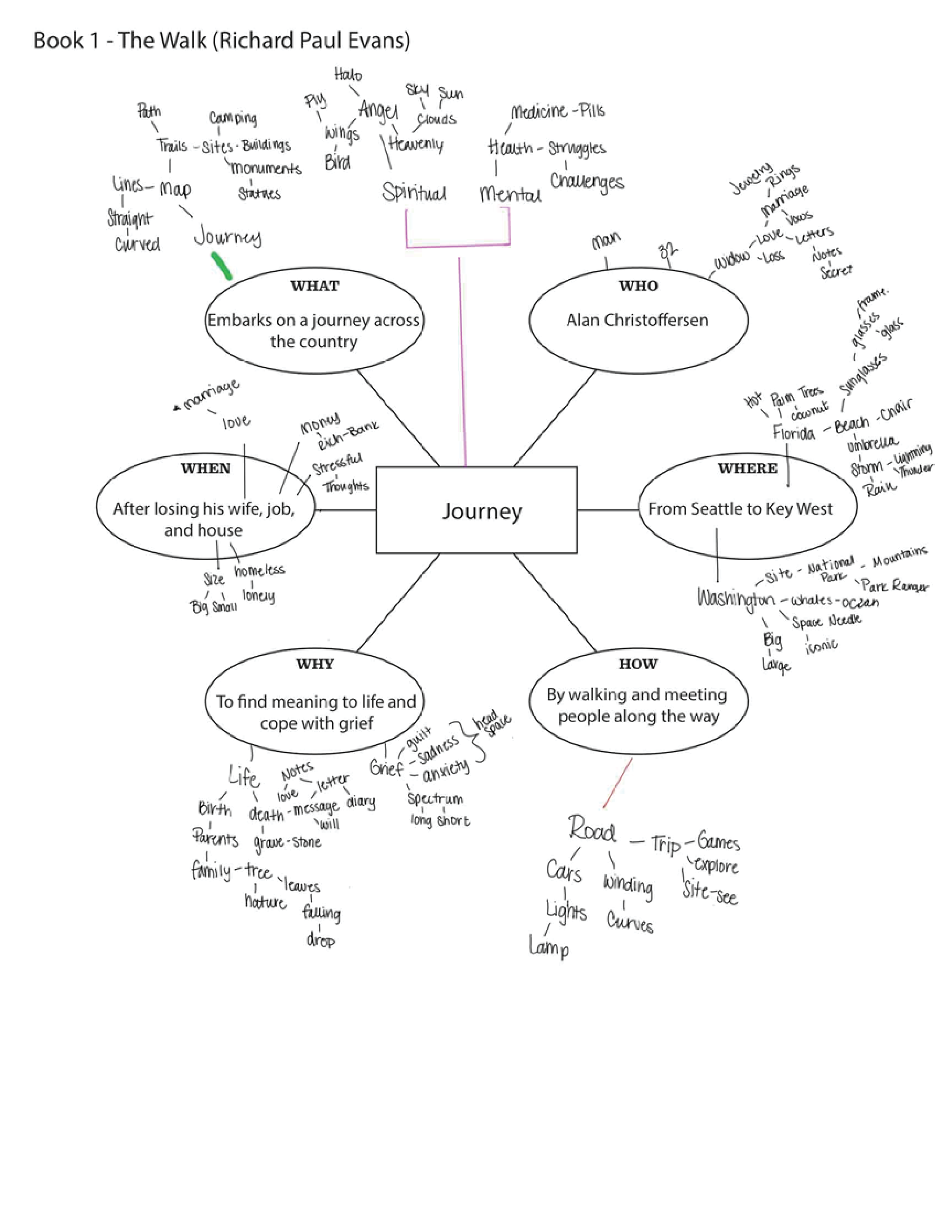 For my research, I started by going over book series that I have read and enjoyed reading. I found a five book series called “The Walk” by Richard Paul Evans that I read when I was in high school. I really enjoyed these books so I chose these and got them approved to continue working on them. I reread the first three books and took notes over when the book happened, who the characters were, the settings, etc. I then made each book a mind map and started working on thumbnails from that.